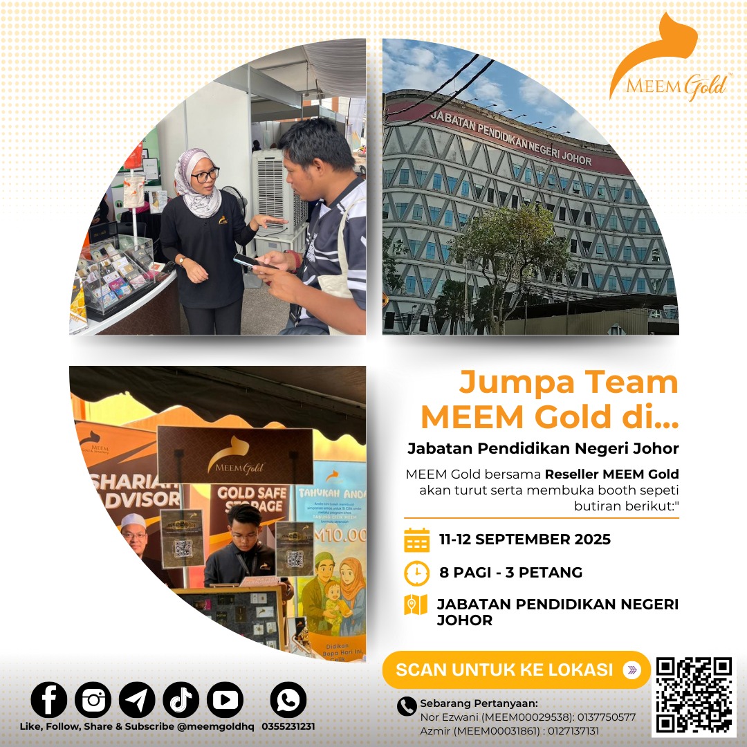 MEEM Gold akan membuka booth di Jabatan Pendidikan Negeri Johor pada 11 - 12 September 2025 (Khamis & Jumaat).