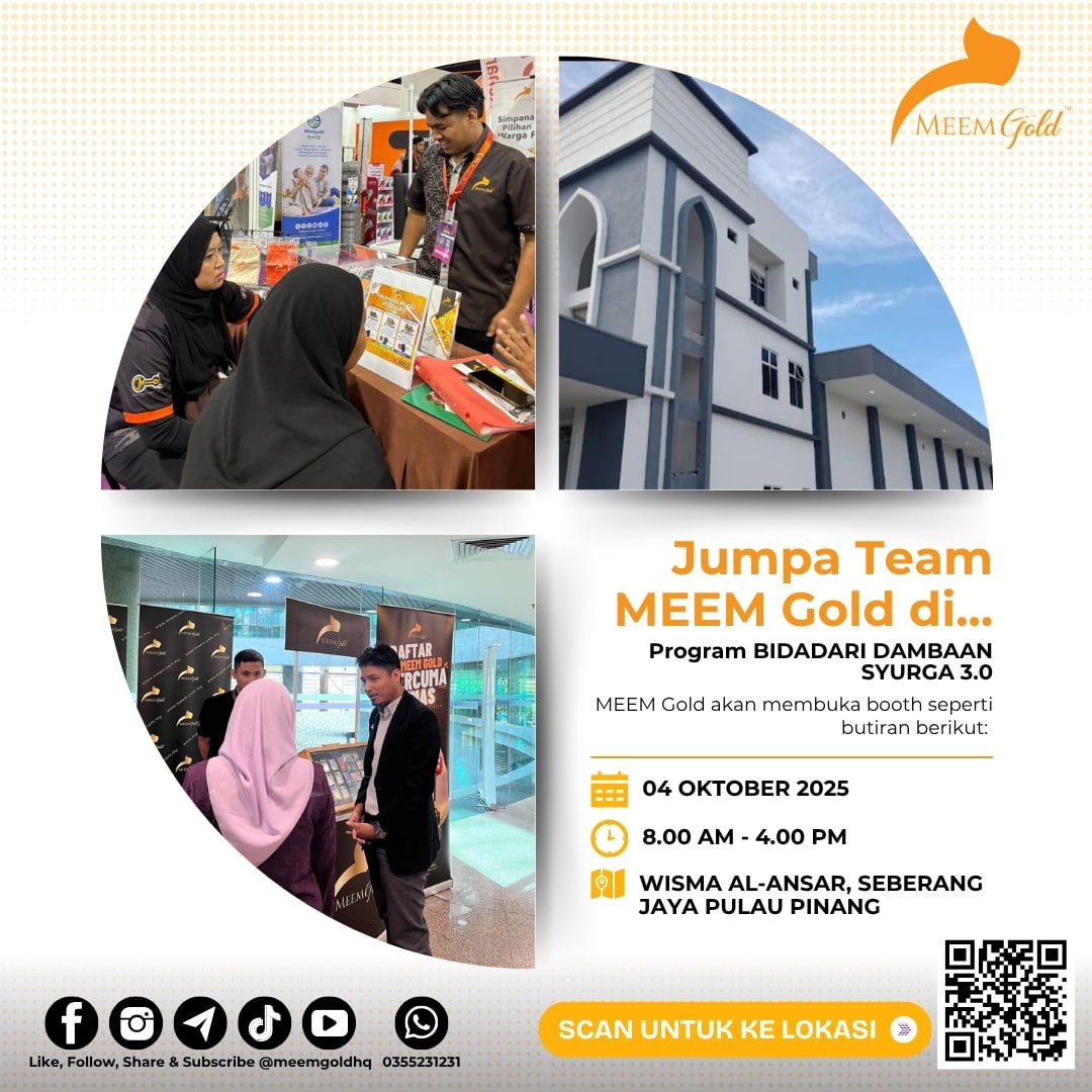 MEEM Gold akan membuka booth khas sempena Program Bidadari Dambaan Syurga 3.0. Datang dan rebut peluang untuk dapatkan konsultasi percuma mengenai simpanan emas