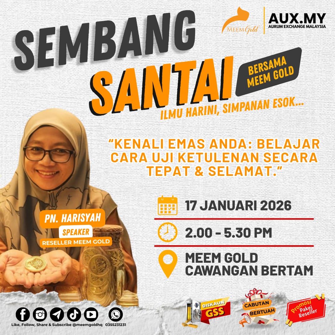 Sertai Seminar Sembang Santai di MEEM Gold Bertam. Belajar mengenali emas dan uji ketulenannya sendiri menggunakan alat profesional yang disediakan.