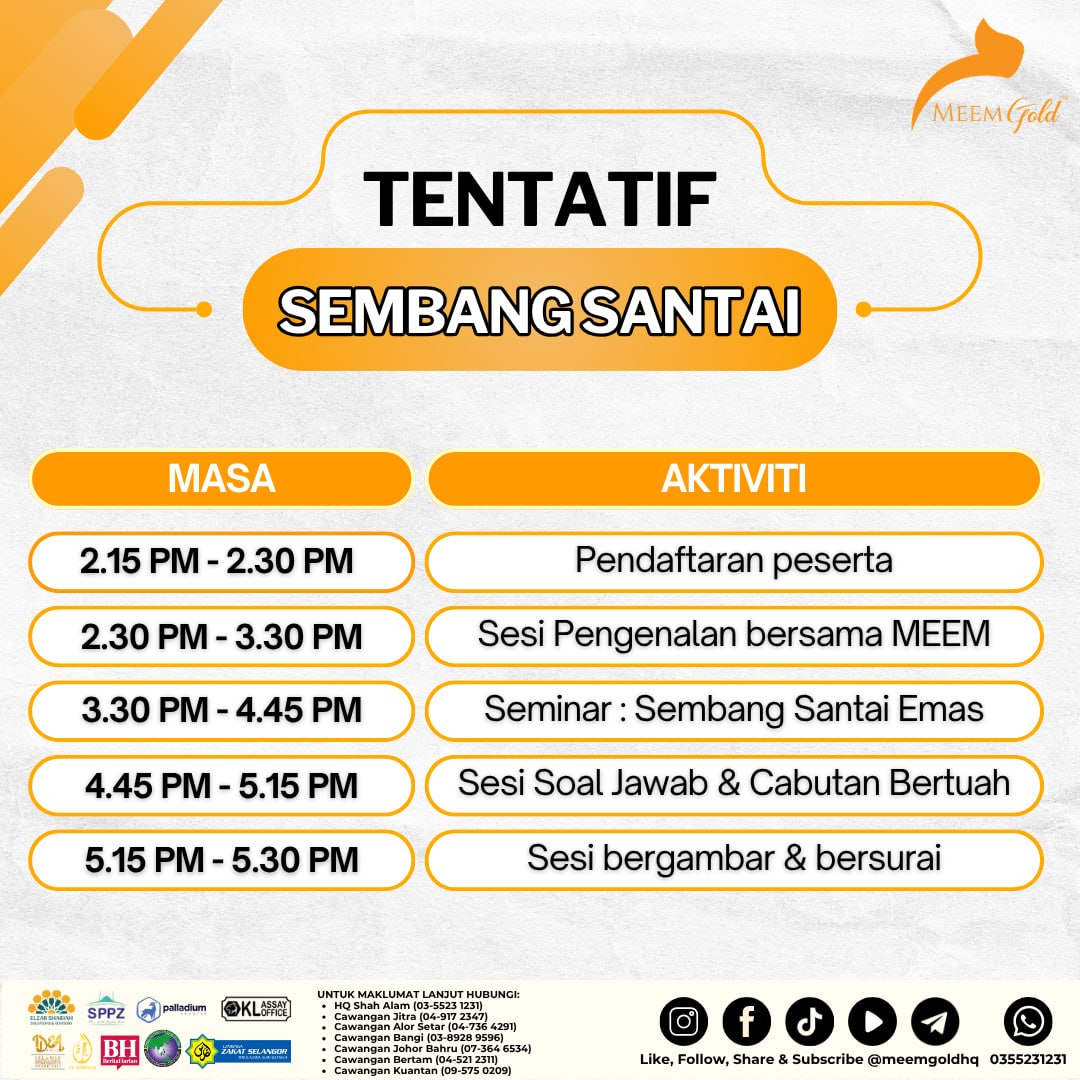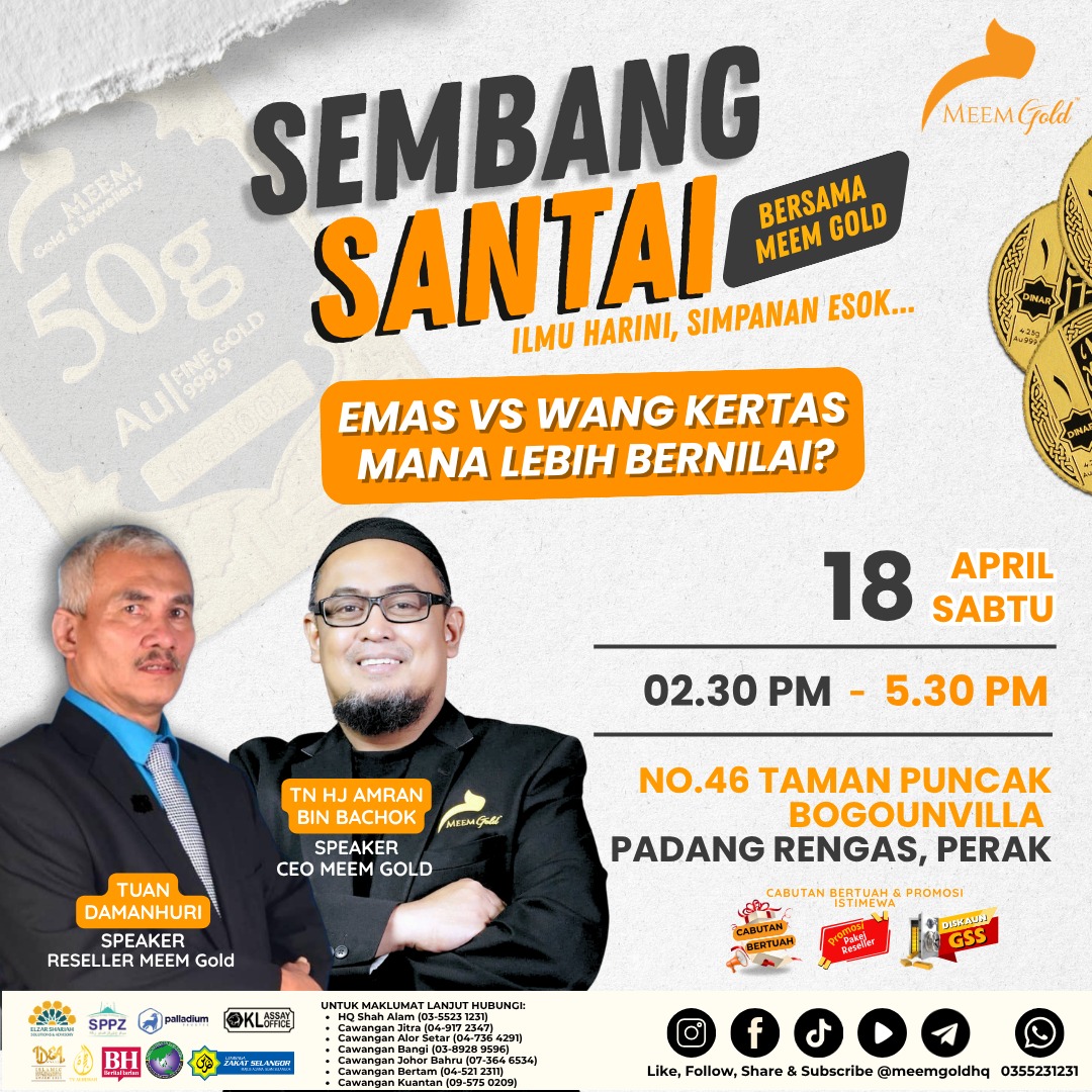 Melalui sesi Sembang Santai ini, anda akan mendapat pendedahan ringkas dan bermanfaat tentang kepentingan simpan emas, bagaimana ia membantu dalam perancangan kewangan, serta peluang menarik bersama MEEM Gold.